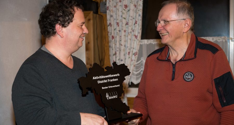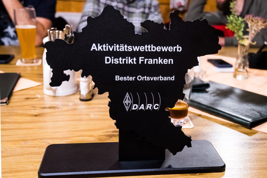 Die Mühe hat sich ausgezahlt: Zum sechsten Mal in Folge haben wir den ersten Platz in der OV-Wertung des Frankencontests erreicht. Zur Versammlung am 28.11. wurde der neue Pokal von Contestauswerter Attila DL1NUX erstmals vorgestellt und an uns überreicht. Anders als in den letzten Jahren handelt es sich um einen Wanderpokal, der jedes Jahr an den erstplatzierten OV weitergereicht wird. Eine Gravur auf der Rückseite erinnert zukünftig an die Gewinner der vergangenen Jahre.