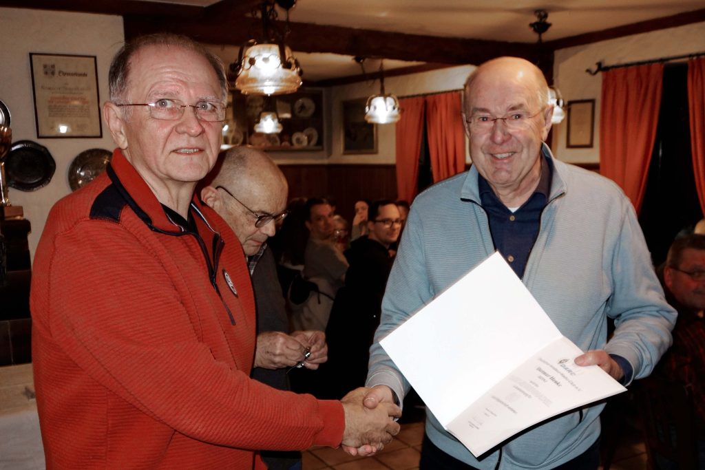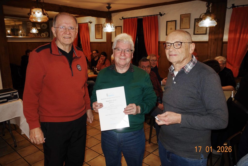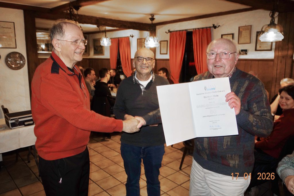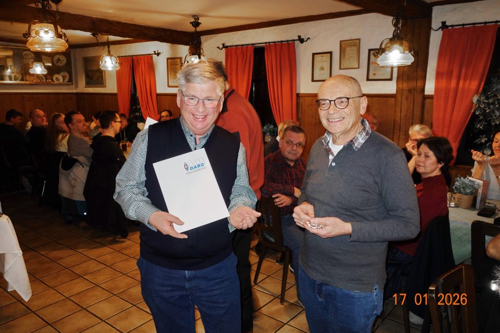 Vor dem Essen begrüßte OVV Dietmar DL6NCF die Anwesenden. Im Anschluss wurde DH6NAN Matthias für 50 Jahre Mitgliedschaft im DARC geehrt. Matthias ist unser aktiver VHF/UHF und SHF-Profi. DC4YR Herbert bekam ebenfalls für 50 Jahre eine Urkunde überreicht. Er ist im OV nicht so sehr aktiv. Auf Grund beruflicher Verpflichtung als Feuerwehrkommandant und sein Engagement beim Roten Kreuz lassen ihm wenig Zeit für das Hobby. Unser Top-DXer und CW-Profi Herbert DL8UP wurde ebenfalls für 50 Jahre geehrt. Herbert ist ein wertvolles Mitglied – im OV immer aktiv und hilfsbereit. Der vierte in der Runde Dietmar DJ3NJ wurde für 60 Jahre geehrt. Das ist so wie die „Diamantene Hochzeit“ und inzwischen selten geworden. Dietmar einer unserer aktivsten Mitglieder ist auf allen Bändern QRV und er schwingt noch fleißig den Lötkolben. DIY steht bei Ihm an erster Stelle. Bei unseren OV-Aktivitäten ist Dietmar immer präsent.
